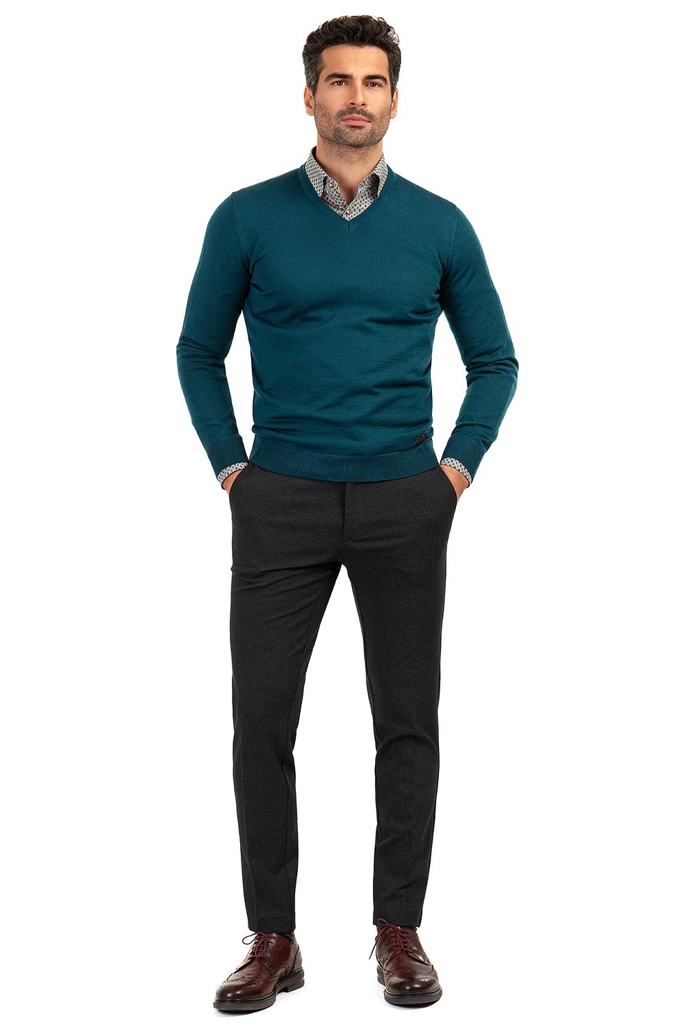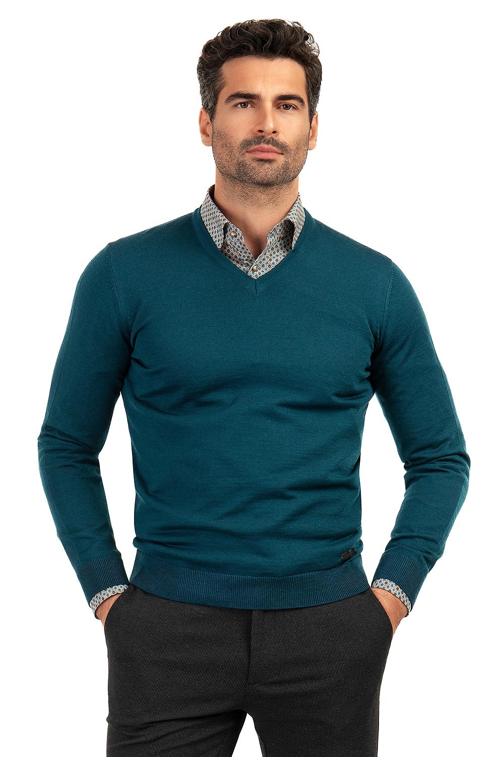 Pulover slim albastru in v