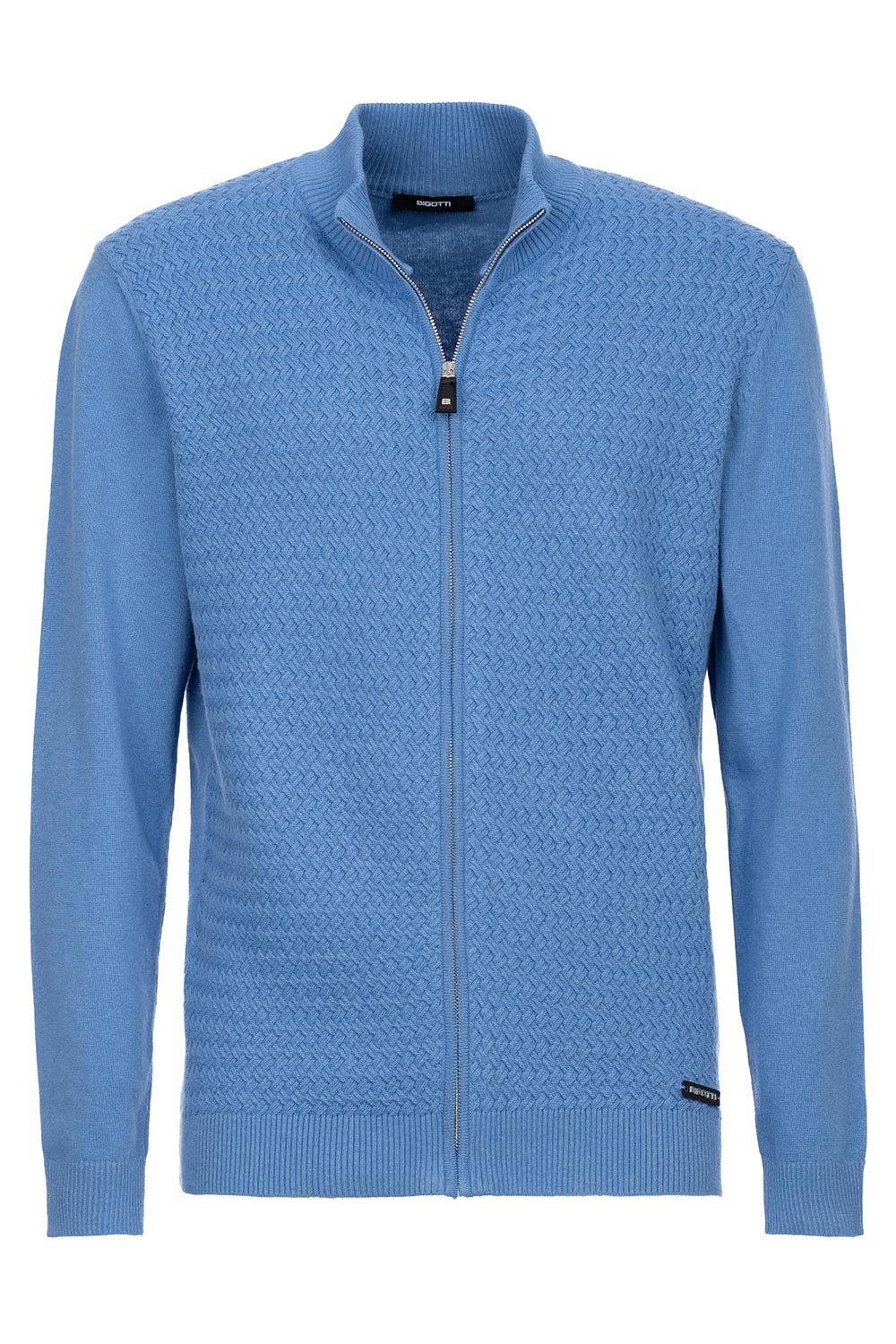 Pulover slim bleu cu fermoar din bumbac si amestec
