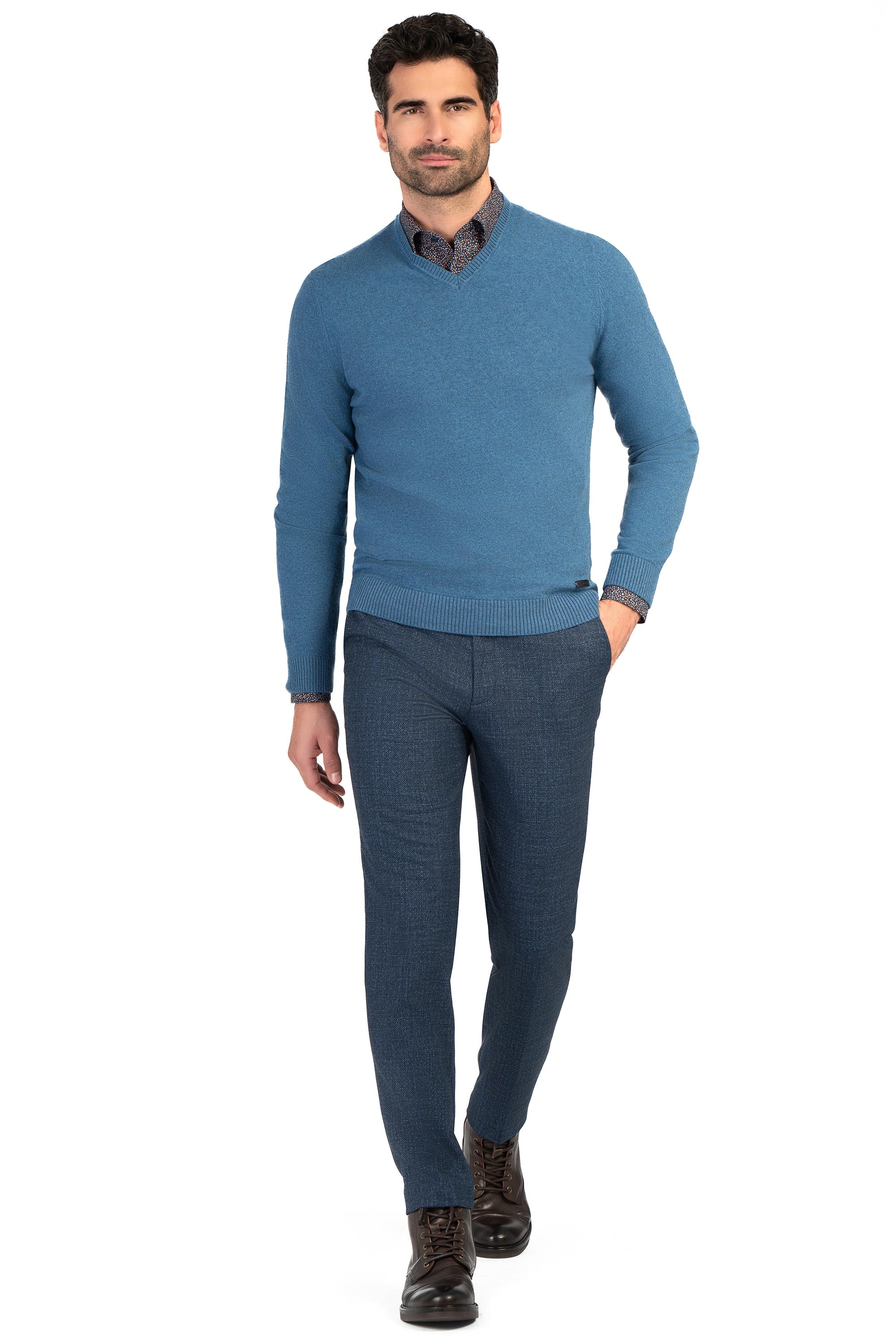 Pulover slim bleu guler in v 1
