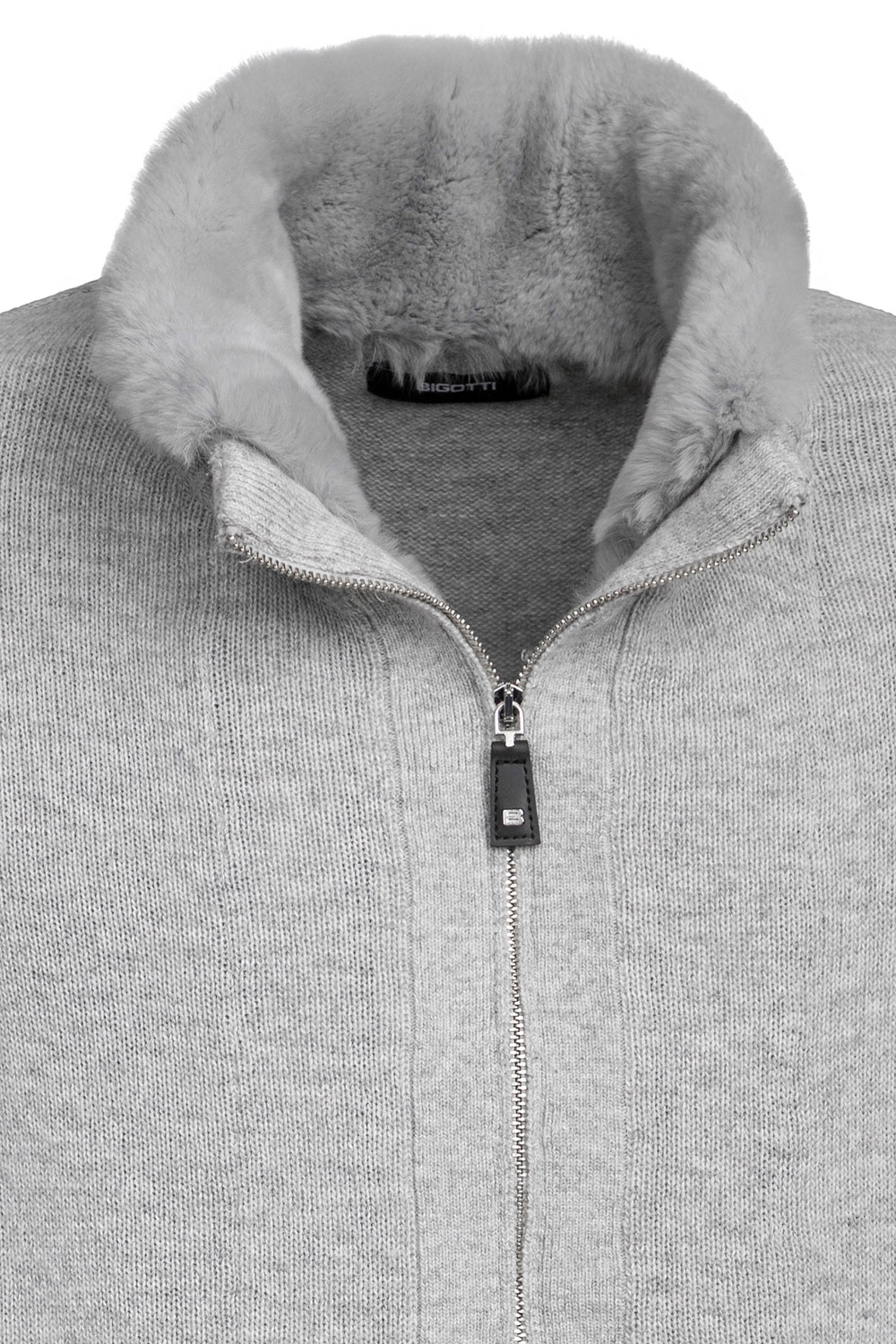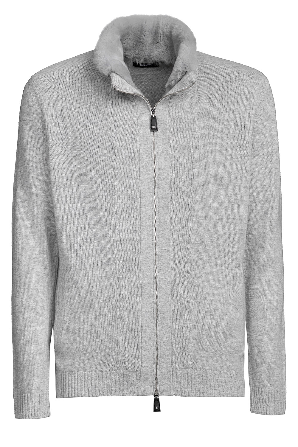 Pulover slim gri cu fermoar, din amestec cu casmir si guler blana iepure