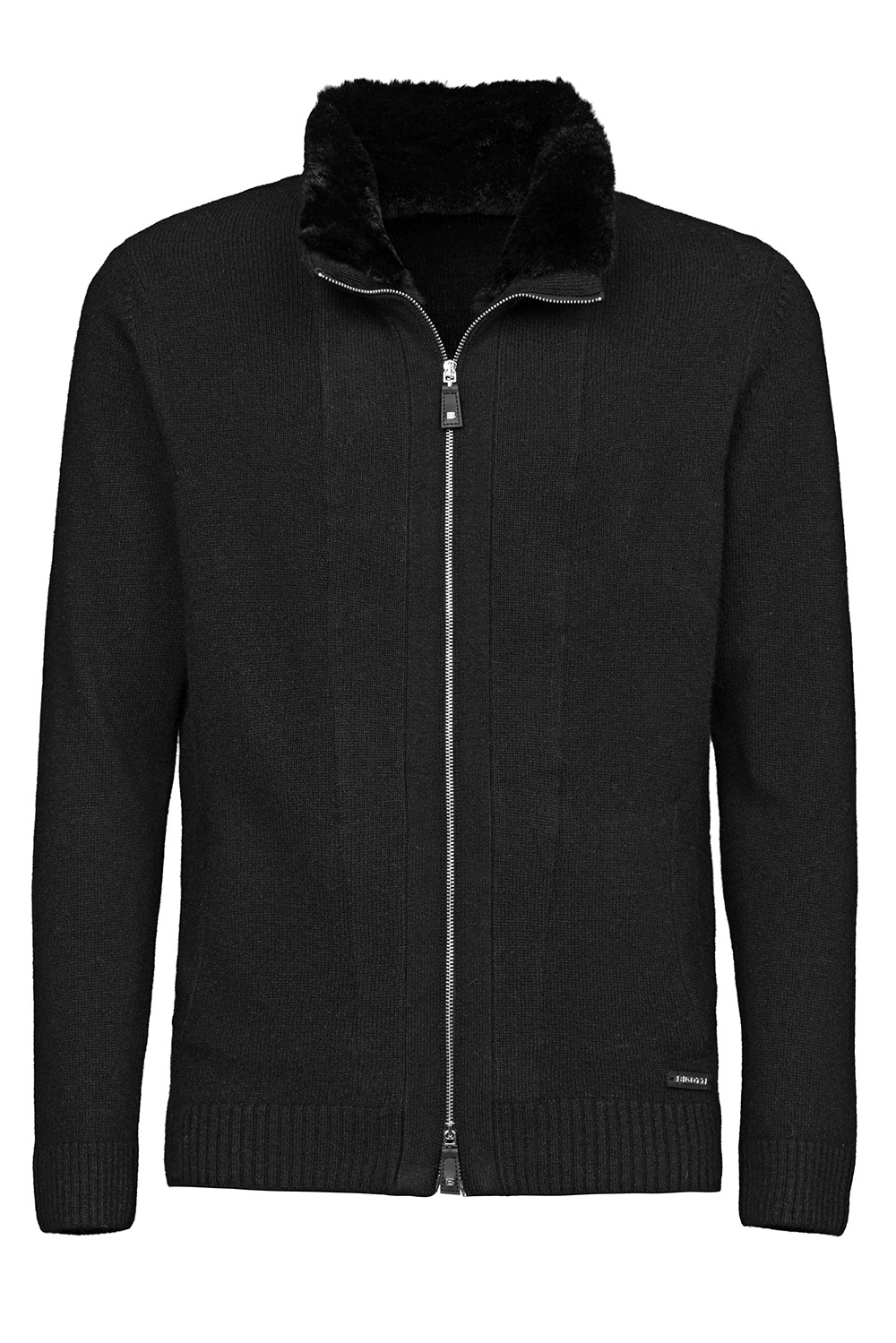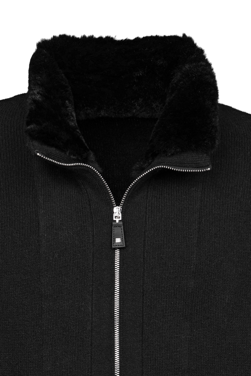 Pulover slim negru cu fermoar, din amestec cu casmir guler blana iepure