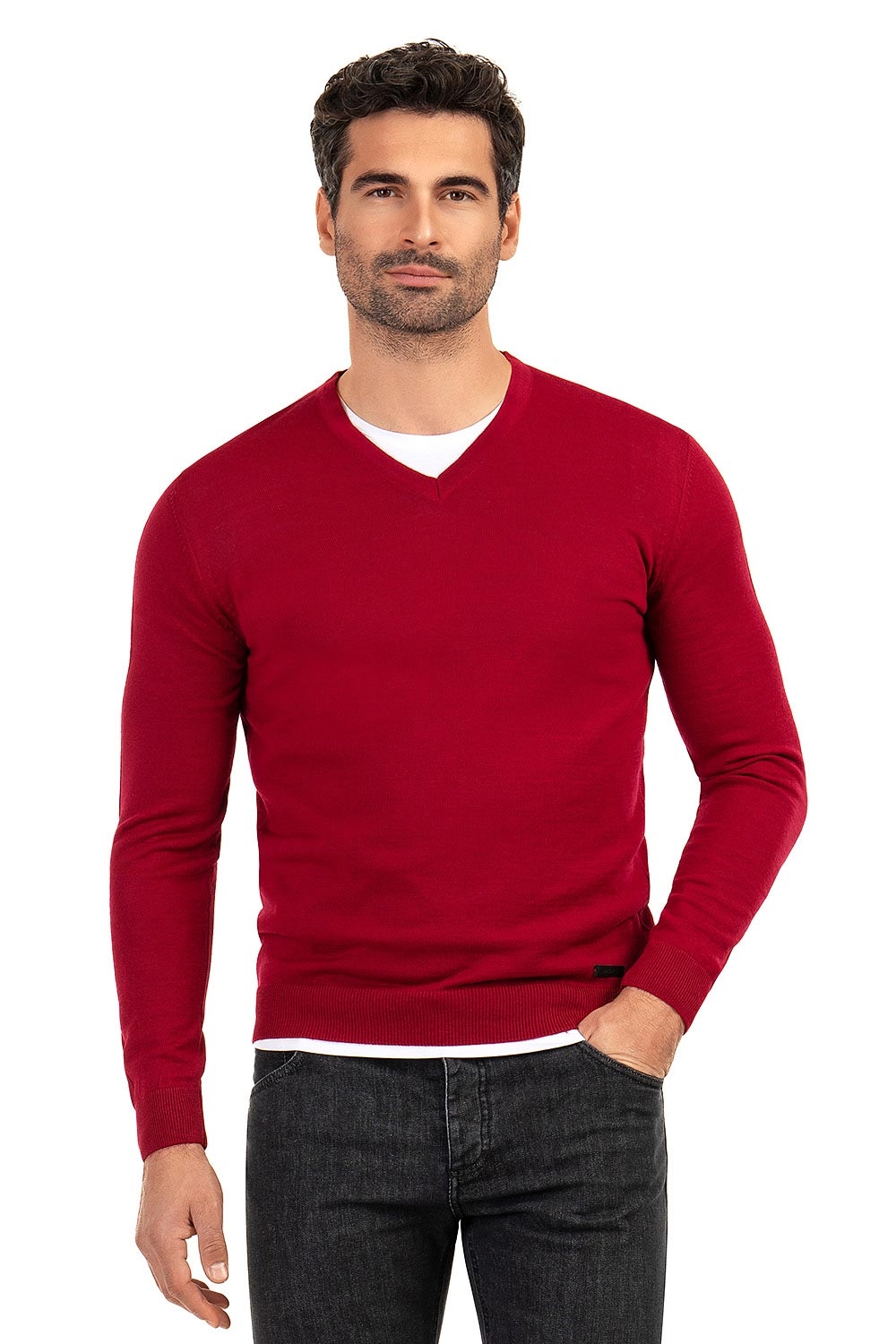 Pulover slim rosu guler in v 3