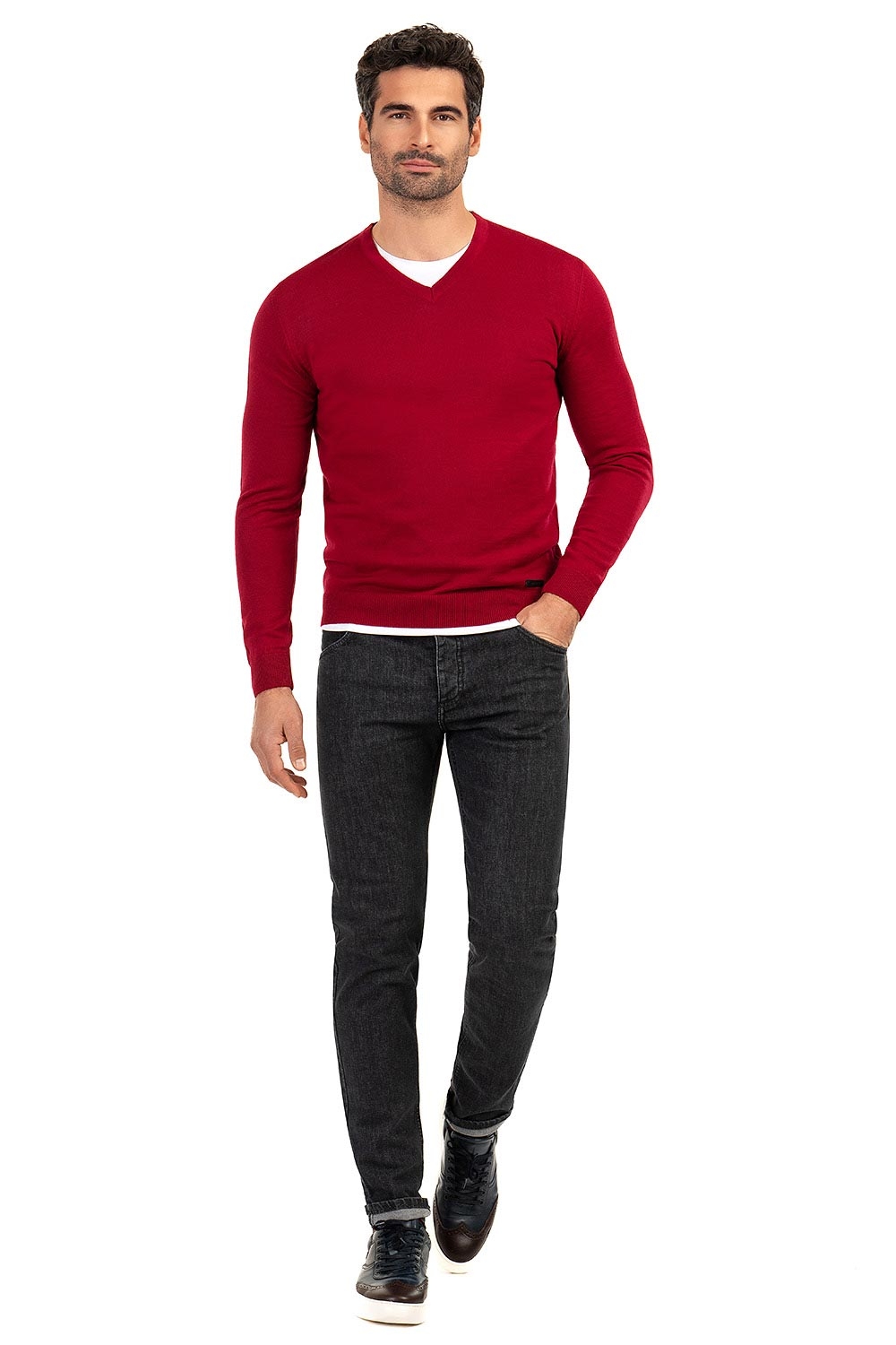 Pulover slim rosu guler in v